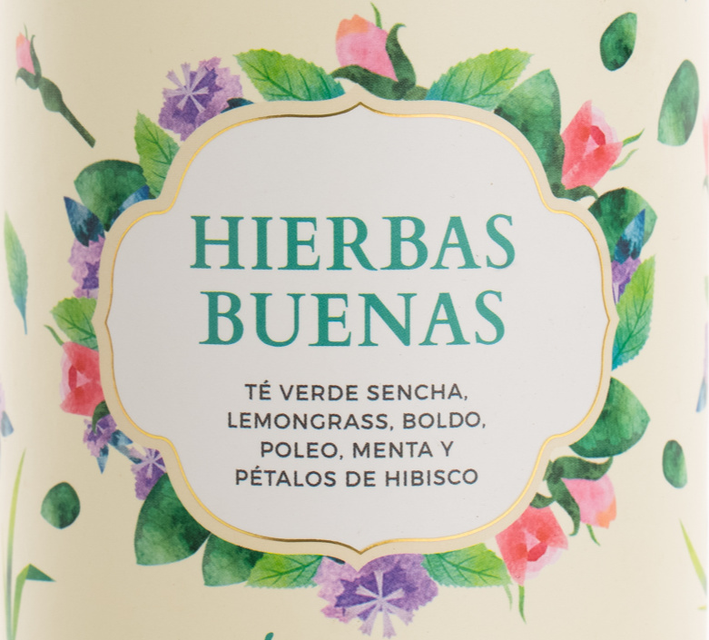 Hierbas Buenas: Té verde Sencha, lemongrass, boldo, poleo, menta e hibisco. Té verde de sabor fresco, herbal y aromático, de color ámbar, excelente como bajativo de comidas e incluso como refresco si se prepara con hielo. Existe evidencia científica que demuestra que el Té Verde puede favorecer la salud.
