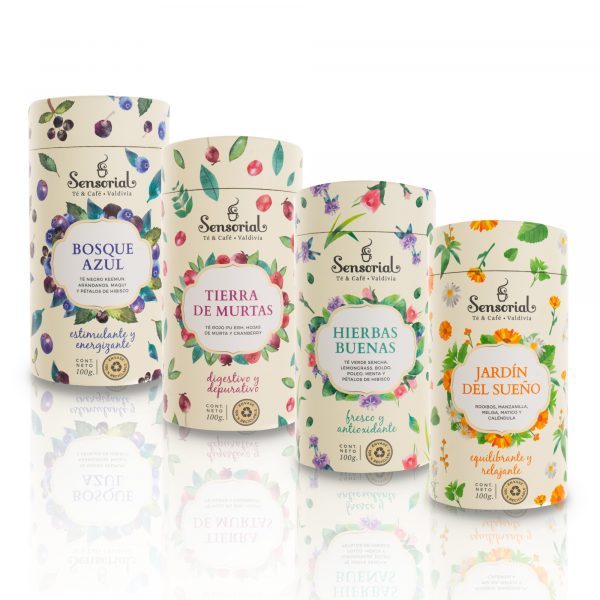 Bosque Azul: Té negro Keemun, maqui, arándanos y pétalos de hibisco. De sabor equilibrado con notas dulces de los ingredientes aliados. Es un té que contiene cafeína y por lo tanto energiza.